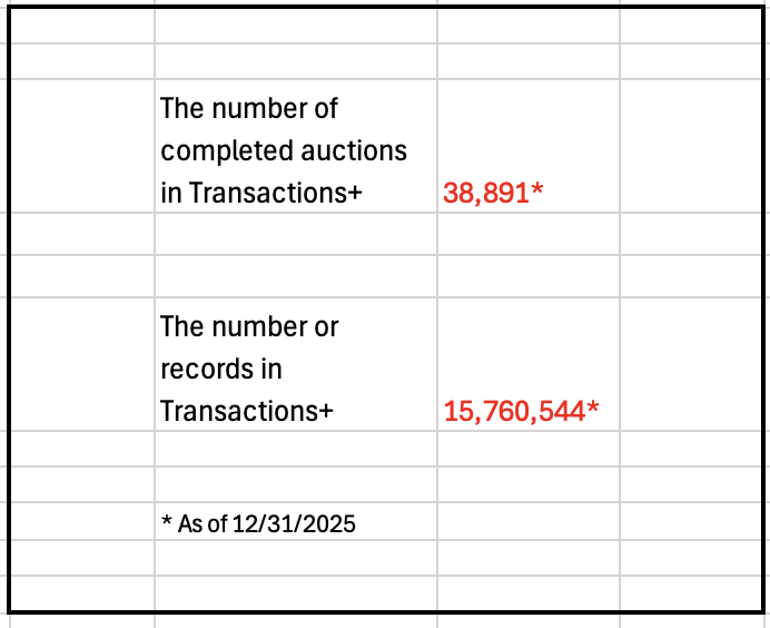 Our Transactions+ has grown during 2025. A year ago, we were offering 14,600,113 full text records. As of today, 12/26/25, we are providing 15,753,679. Roughly 72% of our new records are drawn from the 250 active auction houses whose sales were posted in our Upcoming Auctions search. The balance has been drawn from past auctions. While our numbers are up, we are also committed to respond to all searches within 1 second. Expect our three billion words to respond to your searches instantly.