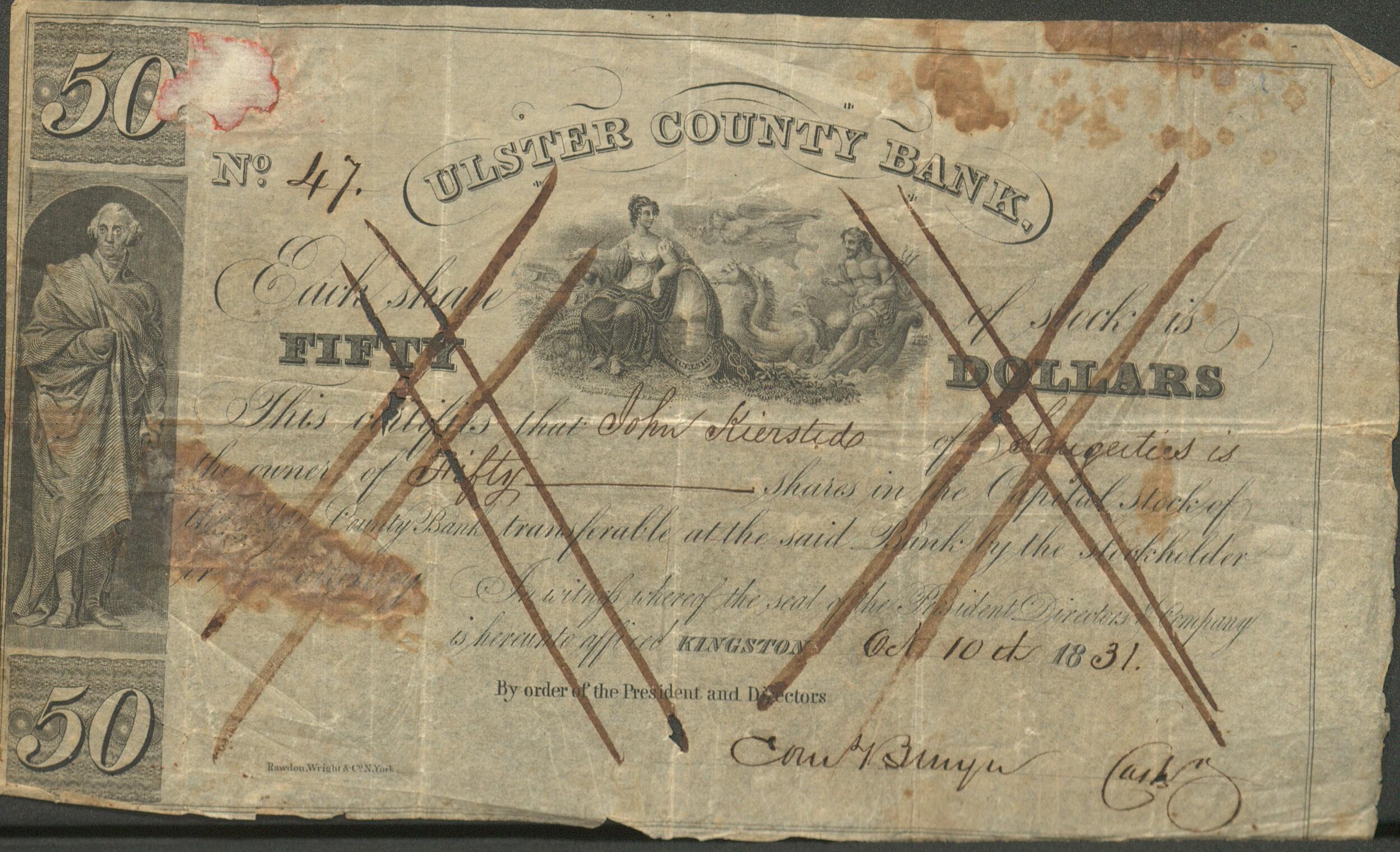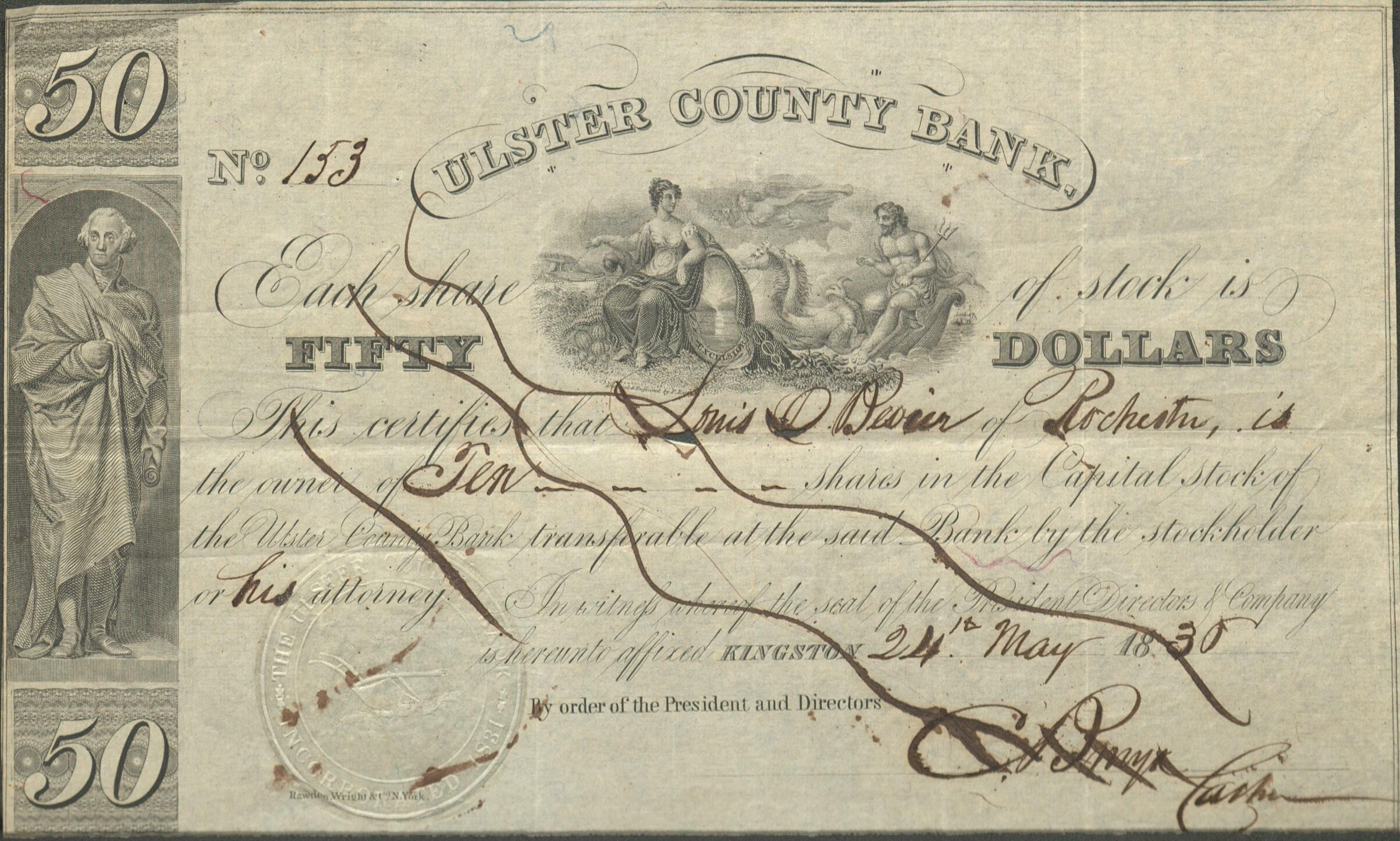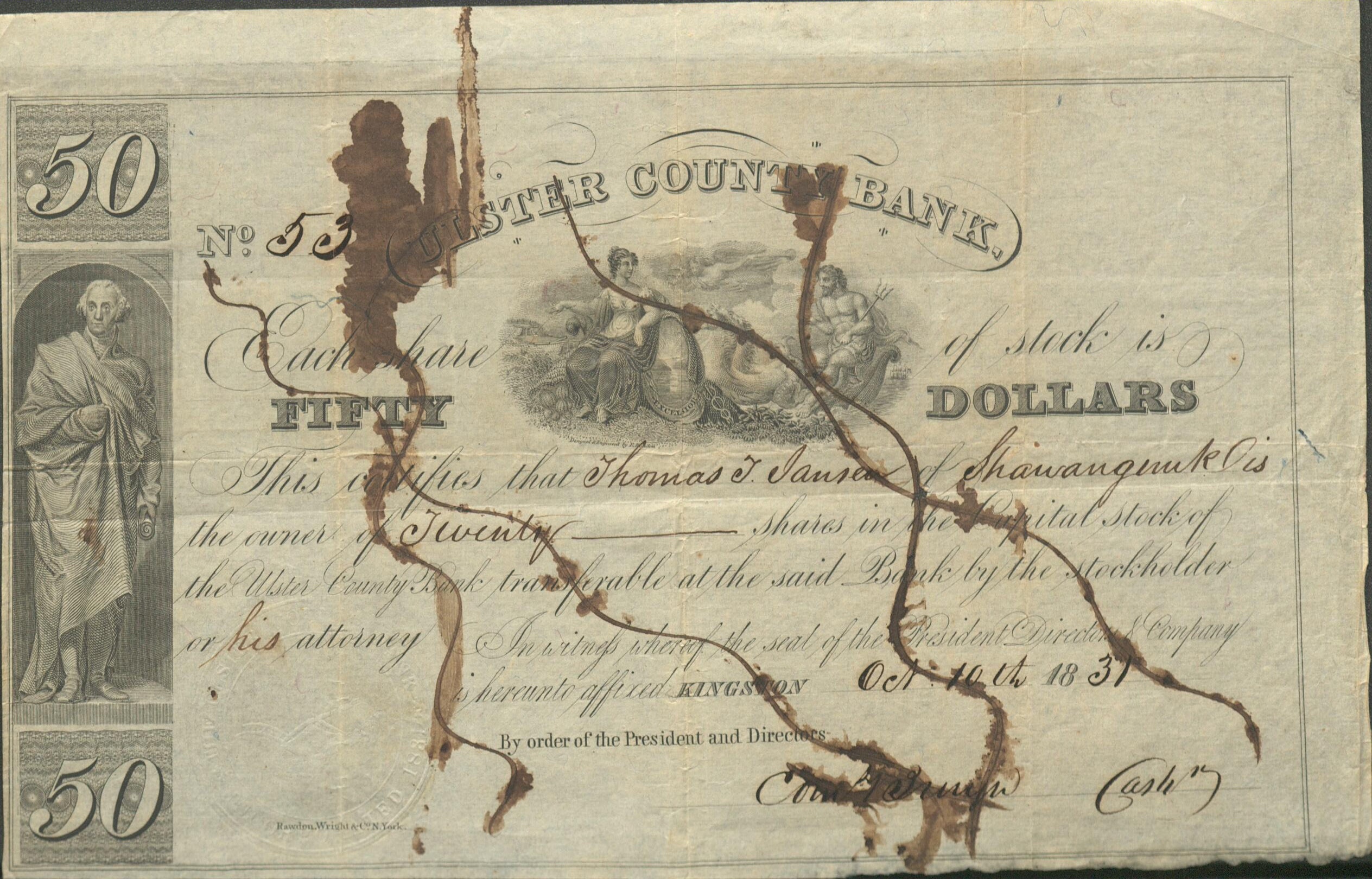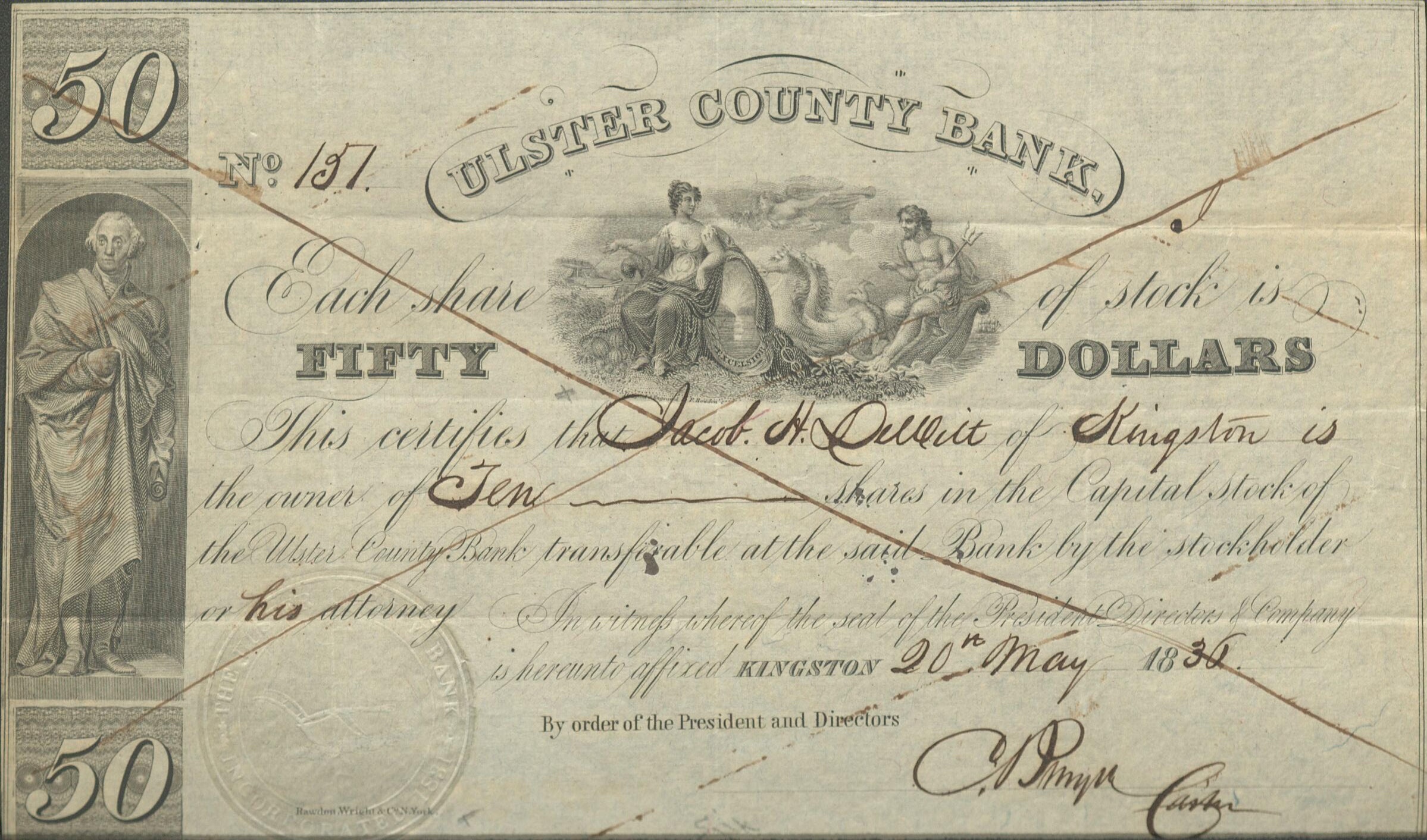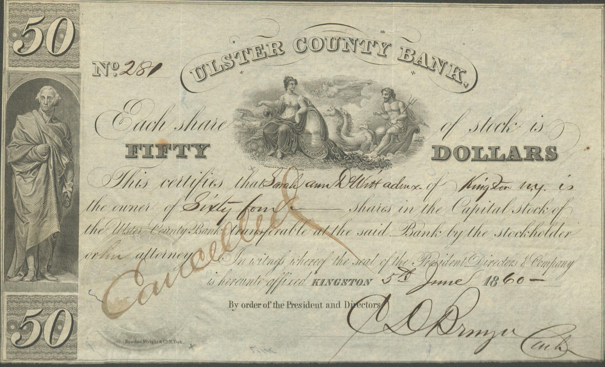 As a collector of books, manuscripts, and maps relating to Ulster County, New York, I’ve acquired an enormous amount of material. About 20 years ago I ran into stock certificates for a bank I’d never heard of: the Ulster County Bank. Those certificates fell into another category called scripophily and I became hooked. They’re a branch of ephemera.