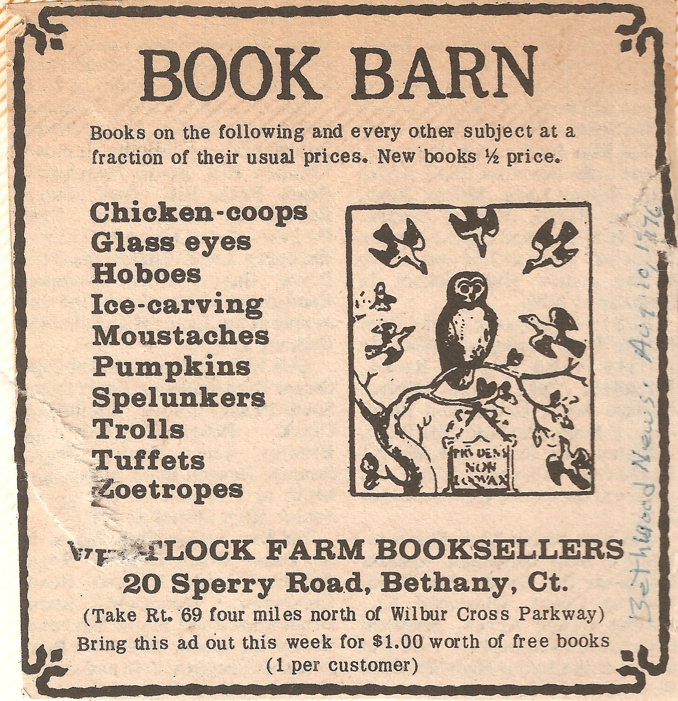 By the 1970s, Gilbert and Everett’s Sperry Road “book farm” was easily Connecticut’s largest used bookseller, and sixty people worked for the various Whitlock businesses. The turnover at the Barn neared half a million books a year, while the farm slowly decreased from its original 600 acres to 190, and the turkey slaughter reduced to 1500 annually.