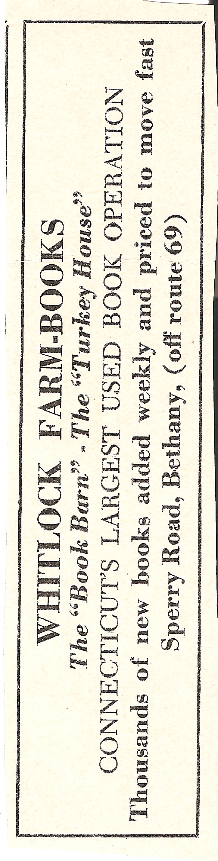 In 1927 the Brinton Lane house burned down, and the family moved to nearby Sperry Road. Son John found joy taking over the farm chores, raising 10,000 turkeys in one year and keeping 350 sheep. The other boys began to follow their father into the book trade at Whitlock’s Incorporated. At first, younger brother Gilbert did not join them, clearing the land and raising turkeys. But in 1948, as his brother Everett said, “The turkey market went to pieces, so we expanded in books.” He developed his own interest in Western Americana, selling it by mail and using one of the Bethany farm buildings as an office. Everett left the New Haven shop to join him. They still delivered 40-pound gobblers and 4-pound game hens to local customers on Fridays but now advertised both birds and books in New Haven publications.