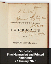 Sotheby’s, Jan. 27: An extraordinary pair of books from George Washington’s field library, marking the conjunction of Robert Rogers, George Washington, and Henry Knox. $1,200,000 to $1,800,000.