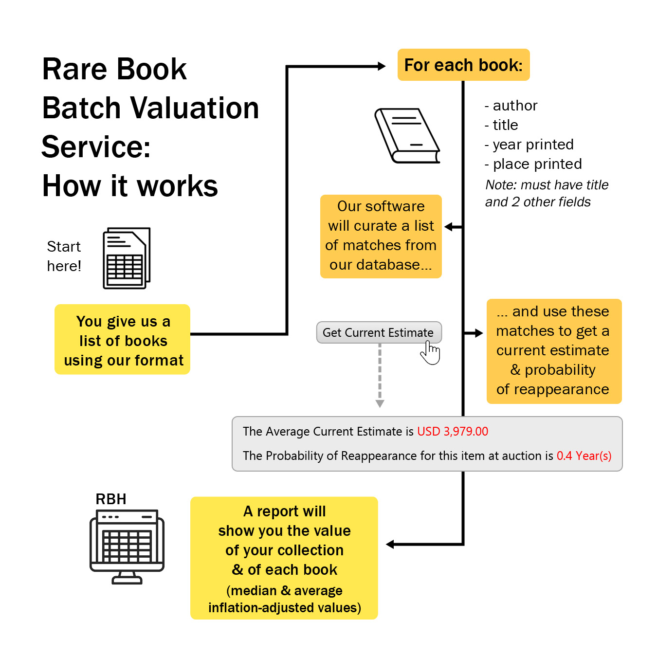 Since Batch Valuation is still in Beta formation, we are making free test runs available to paid annual subscribers to the Rare Book Transaction History at no cost. Up to 3 runs of up to 500 titles may be submitted without charge now through December 31, 2022. Naturally, we welcome your feedback as we work to perfect the presentation of results and the algorithms that power the estimates to best serve your needs. We are available for follow up Zoom sessions to discuss results and receive your feedback and ideas for ways to improve the service!