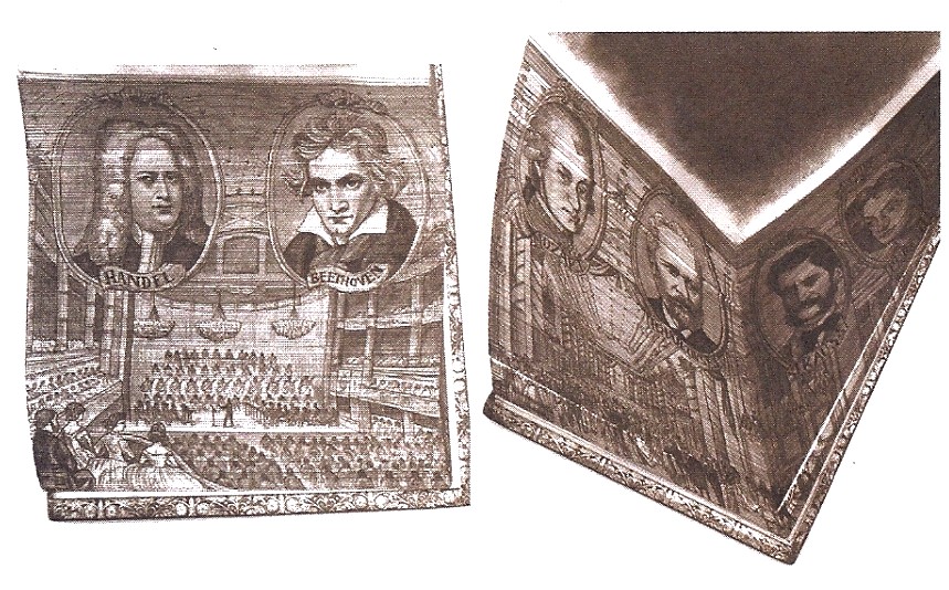 Item 4 is Sammlung auserlesener Gesangstucke mit Begleitung des Pianoforte, two volumes circa 1835-40. It translates to a collection of vocal pieces with piano accompaniment. It is appropriate for the two magnificent paintings, each surrounding all three sides of a volume. Clare Brooksbank is a present-day artist, though the volumes are old. Her work is exceptional. These paintings depict views of a concert hall, with portraits of great musicians, such as Beethoven, Mozart, Chopin, Bach, Hayden and Tchaikovsky, superimposed on the scene. $2,000.