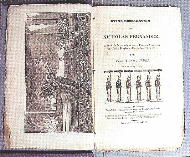 Of course, there were Spanish pirates too, case in point, one Nicholas Fernandez. By his own admission, Fernandez brutalized, tortured, killed, and whatever else awful he could think of to his victims on the ships he seized. Although claiming to be of respectable origin, and writing like a well-educated man, he was still no gentleman. Item 2 is the Dying Declaration of Nicholas Fernandez, who with Nine Others were Executed in front of Cadiz Harbour, December 29, 1829… It was published in 1830. Supposedly, while awaiting execution for his crimes, Fernandez penned this confession. I cannot vouch for the accuracy of all he says, as this booklet is something of a temperance tract, and those in the movement at times tended to speak in hyperbole. Fernandez blames his and his men's misbehavior on being drunk, and goes on to cite statistics on English financial losses caused by use of alcohol, information one might not expect the average Spanish pirate to possess. $2,500.