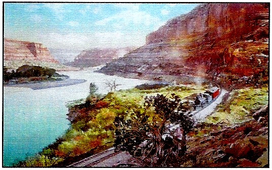 The image you see on this page (and a blow up from it is seen on the catalogue's cover) is called Ruby Castles Canon of the Grand. This is a 1900 print by William Henry Jackson of a Denver & Rio Grande railway train making its way through Ruby Canyon. The rail line runs through the canyon, along the banks of what was then known as the Grand River (today known as the Colorado). The railroad parallels the Colorado River along the Colorado-Utah border, from Mack, Colorado, to Westwater, Utah, and the only practical way to view the canyon, other than rafting, is by train. The red cliffs are present along the river just across the Utah side of the border. Item 107. $3,000.
