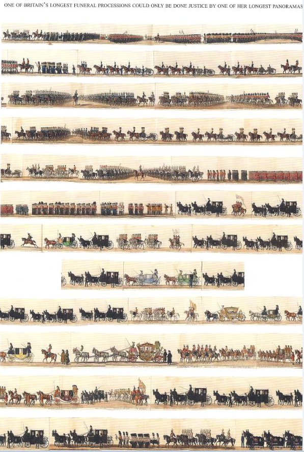The Duke of Wellington was a major British figure during the first half of the 19th century. Joining the army in 1787, he rose in rank through various battles. His performance during the Napoleonic Wars resulted in his being named field marshal. He served as Ambassador to France after Napoleon was defeated, but after the French Emperor made his escape and returned to power, it was the Duke who led the forces at Waterloo that brought Napoleon's career to its final conclusion. Wellington was a great hero, and was elected to Parliament. In time, he would rise to be Prime Minister. His popularity was perhaps not so great in this role. He was quite conservative, opposing popular electoral reforms. Nevertheless, when he died in 1852, the Duke of Wellington was revered as a great hero. Over 10,000 people participated in his funeral march. One and one-half million spectators viewed the spectacle. Item 1 is Henry and George Aiken's An Elaborate Panorama View of the Entire Funeral Procession of the Duke of Wellington, probably a second issue from 1853. The panels illustrating the parade, when put together, create a panorama over 65 feet long. £3,500 (US $5,331).