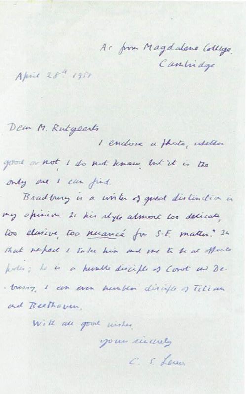 Here is a letter from one of the most notable fantasy/science fiction writers of the 20th century written about another. C. S. Lewis wrote to a correspondent about young writer (22 years his junior) Ray Bradbury in 1951. He compares Bradbury to himself this way - “I take him and me to be at opposite poles; he is a humbled disciple of Corot and Debussy, I an even humbler disciple of Titian and Beethoven.” I must admit that I do not have sufficient knowledge of art and classical music to decipher precisely what that means. Item 46. $12,500.
