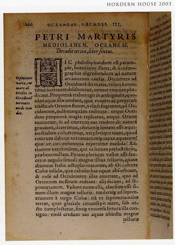 Martyr’s De Rebus Oceanicis contains the first account of Balboa’s sighting of the Pacific Ocean, as well as the earliest account of Cabot’s discoveries along the northeast coast of America (Decade III, Book 6).