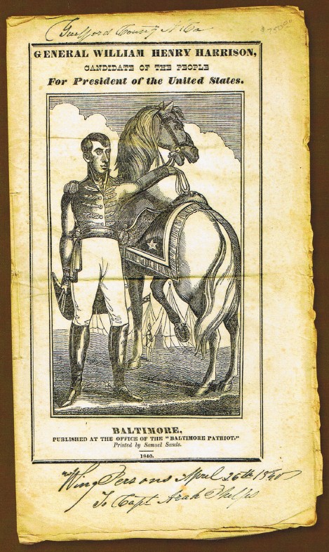 William Henry Harrison was the first, and next-to last successful Whig candidate for president. Harrison's supporters played up the humble, man-of-the-people image to the hilt. Harrison was "Old Tippecanoe," running on a campaign of "log cabin" and "hard cider." He was hardly so humble as he was portrayed, his father having been a Virginia governor and signer of the Declaration of Independence. Still, the image stuck, and running against an unpopular incumbent, he was swept into office in 1840. A month after inauguration, he lay dead. No one will ever know what kind of a President he would have made. Item 285 is an 1840 election pamphlet headed General William Henry Harrison, Candidate of the People (see image above). The cover shows a younger Harrison in military gear, rather than the 67-year-old edition who ran for office. $750.