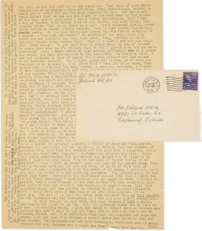 Another letter from Kerouac to White took in $82,550. Written while being treated in a hospital in 1951, Keoruac closes with a reassuring, “Sir, I'm not about to die.” He was right. Keoruac still had 18 years to go. $82,550. Another such letter to White took in $53,340. Kerouac writes, “I've written 86,000 words almost finishing On The Road.”