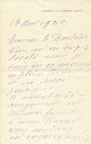 French Impressionist painter. A.L.S., Claude Monet, two pages (written to the first and third sides of the bifolium), 8vo, Giverny par Vernon, Eure, 16th August 1920, to a Doctor, in French. Monet writes in bold pencil and states, in full, 'Vous m'en voyez désolé mais je suis en ce moment en plein travail et ne reçois personne, le moindre dérangement est toujours funeste à mon travail. Vous voudrez m'excuser auprès de votre ami. Avec tous mes regrets, recevez l'expression de mes sentiments distingués'