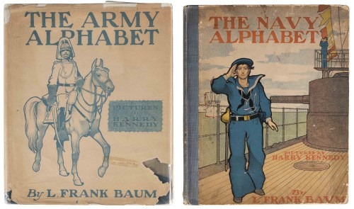 L. Frank Baum (of Oz fame) wrote the verses for The Army and the Navy Alphabet, 1900, George Hill, Chicago. Jacket worn and chipped, with tape repairs; varying wear and staining to boards; hinges cracked, pages slightly toned, occasional marginal smudges; good.