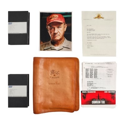Hollywood Pictures, 1995, Comprising one wool and leather jacket with patches on the sleeves and inscribed CRIMSON / TIDE to the back; one leather binder embossed CRIMSON TIDE / GENE HACKMAN with a 121pp script dated REVISED 7/26/94; a Xeroxed copy of Gene Hackman's provisional agreements for the film; a group of production material; a colored photograph of Gene Hackman; two VHS copies of Trailer #2; one invitation to the screening at Cinerama Dome,dated May 10, 1995. (Qty.)height of leather binder 13 1/2in.