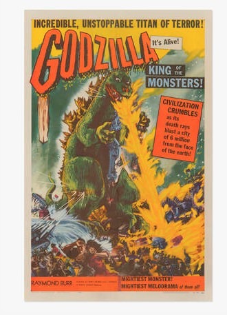 Godzilla: King of The Monsters (Toho, 1956) one sheet 41 h x 27 w in (104 x 69 cm) When a 400-foot-tall prehistoric reptile is resurrected by hydrogen bomb testing, it leaves a trail of radioactive destruction across Tokyo. Distinguished as the re-edited American version of the Japanese masterpiece, this iteration seamlessly integrates Raymond Burr as an American reporter providing a firsthand account of the carnage.