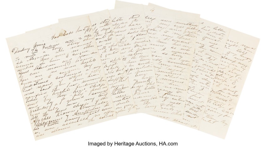 3. A 21 page 1869 letter from Indian fighter George Custer to his wife sold at Heritage on Feb. 26 for $550,000. The presale high estimate was $24,000.